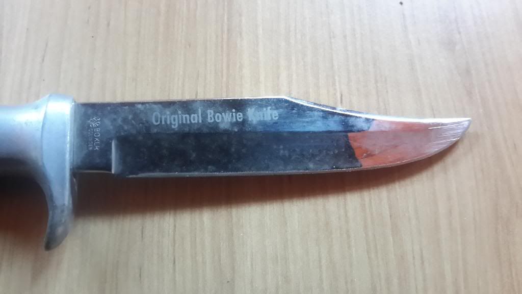 Bu bıçak en az 35 yaşında, Alman yapımı bir Böker-Solingen Bowie. Ben daha ilkokulda iken dayım pedere hediye getirmişti. Uzunca bir aradan sonra tekrar elime geçti. Paslanmaz çelik namlusu var ama malzemenin içeriği hakkında hiç bir bilgim yok.