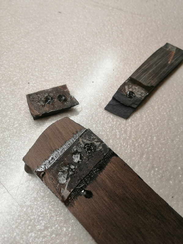 Ufak bir parça laminantın bir yüzünden bant zımparada kaplamayı kaldırdım. Laminantın ve ahşabın iç yüzüne matkapla oyuklar açtım (yapışma yüzey alanı artsın diye). Kullandığım epoksi geç donan 3:1 karışım epoksi. İlk karışım anında viskozitesi düşük olduğu için ahşap gibi malzemelerin içine doğru işleyerek daha iyi bi yapışma sağladığını düşünüyorum. Hızlı donan epoksim olmasına rağmen o yüzden testte bunu tercih etmedim.