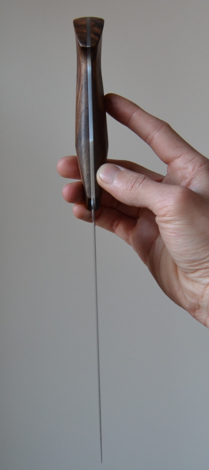 Bu arada sap formu diğer mutfak bıçaklarından (böyle adlandırdım, umarım yanlış olmamıştır) sıyrılmış. Daha çok önceki işlere benzemiş. Senin saplardaki geometrilerini de hep beğenirim hocam, bi sevindirdi diğer işlerden de mi geliyor yoksa diye.
