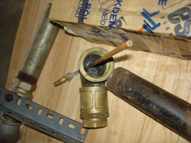 Brülör yapmak çok basit: Önce hava girişi için 1 1/2 parmak (inç) boru girişi, sonra dirsekten dik çıkışı olan bir bakır boru (6mm çap), borunun propan girişi kısmına plastik asetilen hortumuna takılması için eklenti yaptırttım sanayide, diğer ucuna paslanmaz bir pin çaktım ve ortasından 1.5 mm delik deldim...
