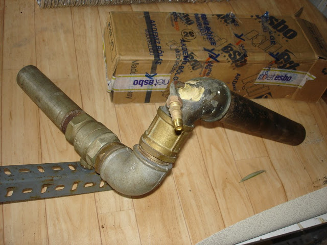 Propan girişinin olduğu dirseğe en son siyah 1 1/2 parmak boru koydum. Bu borunun ucunu hafif dışa açtım çekiçleyerek, yani borunun iç çapı yaklaşık 41 mm sanırım, ancak ocağa girdiği bölümde 4.3 mm oluyor çapı...