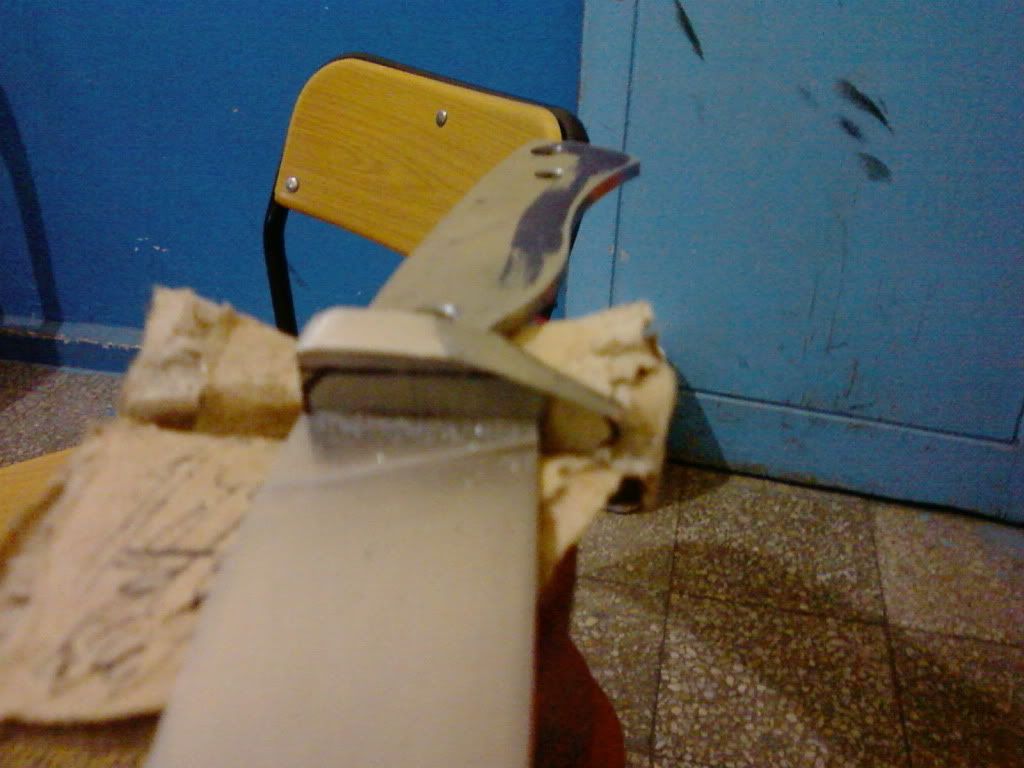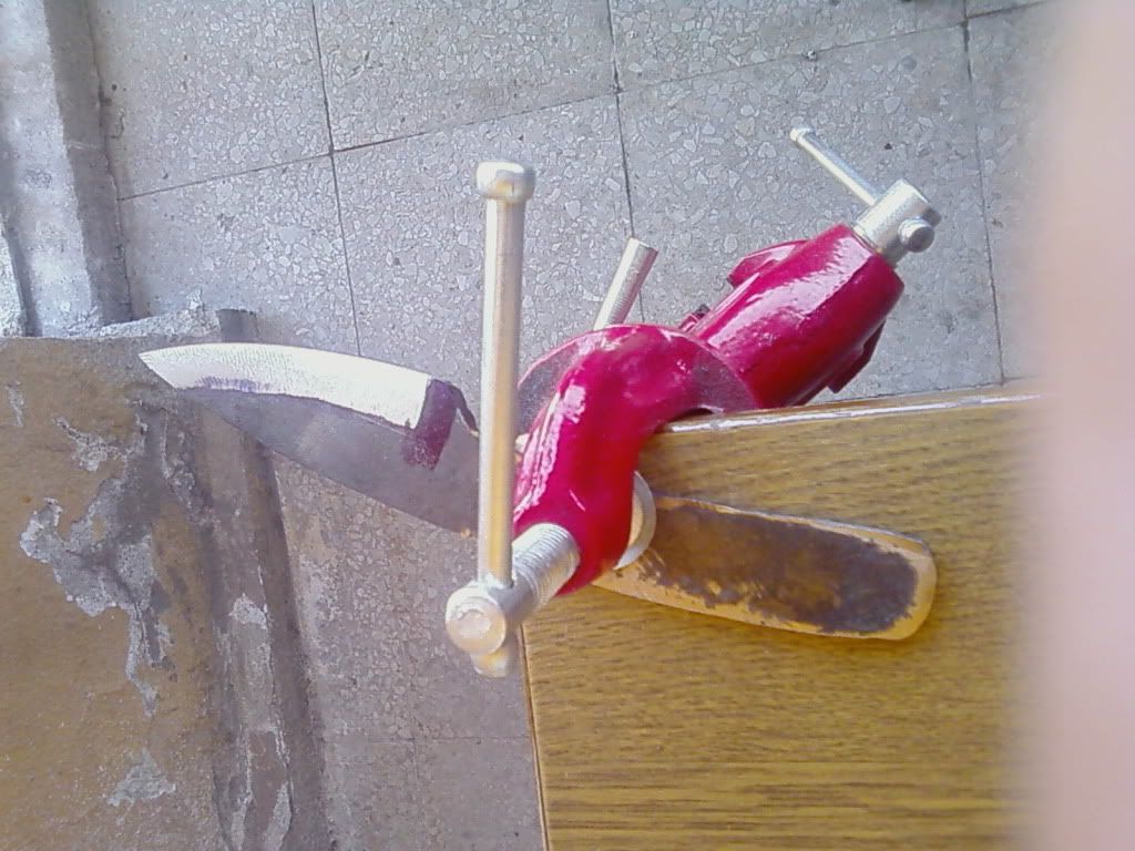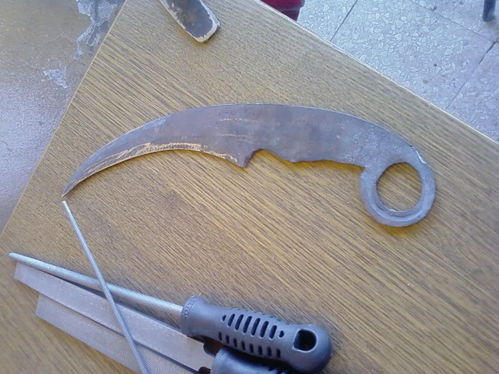 Kabze bölgede en çok bulunan ağaçtan. Ceviz . Ağacı kestirdik marangoza, kuyruklu bir alet ile. Delikleri deldik, cr-ni kaynak elektrodu 4 mm perçin oldu bize. Kabzeyi 320 kum zımpara ile bıraktım. Üstüne bitkisel yağ sürdüm, emdirdim.