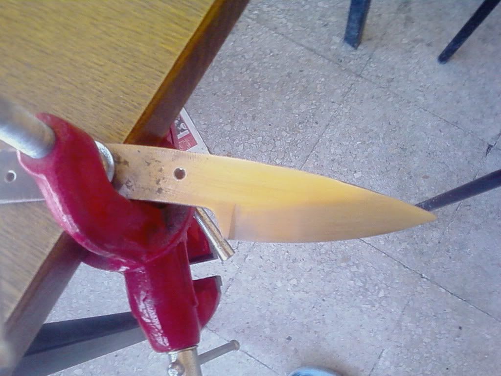 Parça önce şaloma ile kesildi. Eğe ile ağız açıları verildi. 220 kuma kadar zımpara yapıldı. Usta yöresel biçiminde su verildi. Tahmini 750-800 dereceye kadar ısıtılan malzeme önce ağız kısmından yağa batırıldı. Bir miktar tutulduktan sonra çıkarıldı. Bir tekrar daha ve sonra tamamı yağa bırakıldı. Meneviş verilmedi. Bu işlem yapılırken mıknatıs filan kullanılmadı sadece göz aşinalığı ve yılların bilgi birikimi. Az kalsın unutuyordum. Su verme işlemine başlamadan çelik daha kızarken ve kızma aşamasında ağıza sabun sürüyorlar. Tufal yapmasını engeller dedi arkadaş.