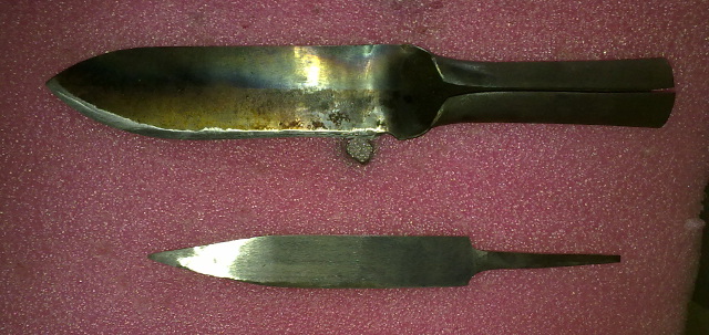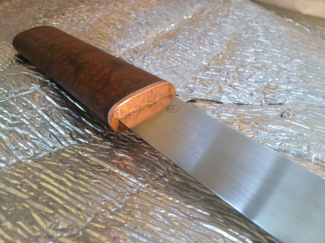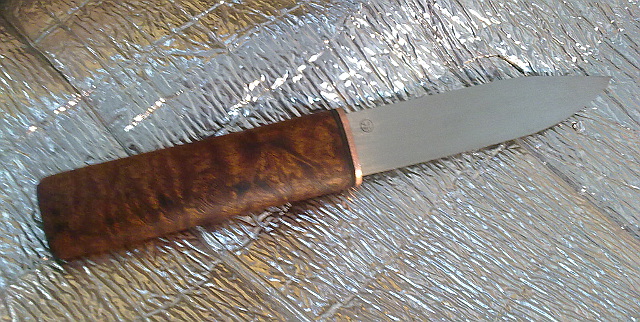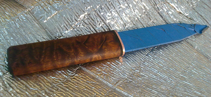 Bu, bir kenarda uzun süre beklemişti. Geçenlerde buna yeniden giriştim. Çelik zaten yeniden kullandığım bir eğeydi. Balçak ve sapta da varolan bakır bir profil parçasını dövdüm. Pamela sapelli de zamanında yaptığım kukriden arttırdığım bir parça.